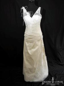 Robe une pièce en taffetas drapé ivoire : bustier avec bretelles en dentelle ivoire formant un décolleté en V, ornées de plumes et fleurs de dentelle. Dos boutonné. Jupe trapèze sans traîne avec rappels de dentelle. Belle coupe originale.