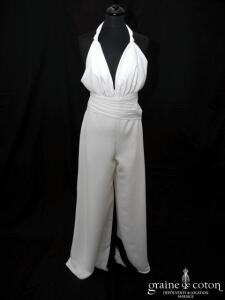 Combinaison une pièce en crêpe : bustier avec bretelle tour de cou, décolleté en V. Large ceinture sur la taille et pantalon large. Pour une mariée hors du commun ! Matière souple agréable avec très beau tombé.