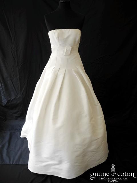 Robe une pièce en mikado de soie ivoire clair : bustier droit coupe empire avec strass sur la ceinture, dos boutonné. Pli creux au niveau de la taille qui s’ouvrent sur la jupe pour lui donner un beau volume, longue traîne pouvant se remonter. Le « plus » craquant : des poches cachées dans 2 plis côtés ! Une robe épurée et originale, grande classe. Housse et jupon inclus.