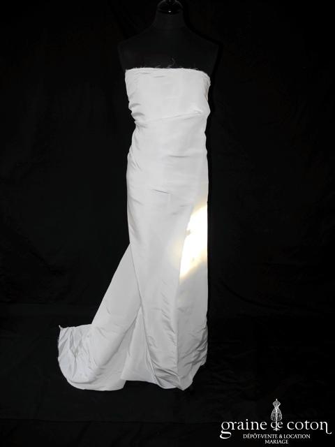 Robe une pièce en taffetas de soie ivoire. Bustier droit avec finitions vives, sans couture. Découpe asymétrique de la robe façon drapé avec volants arrières en volutes. Coupe très originale, belle matière. Housse en coton et étole en tulle ivoire incluses.