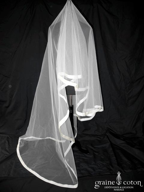 Voile long en tulle ivoire bordé d’un large bais d’organza. Dimensions : 200 * 300 cm. Pic fourni pour la pose du voile.