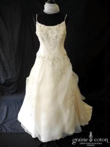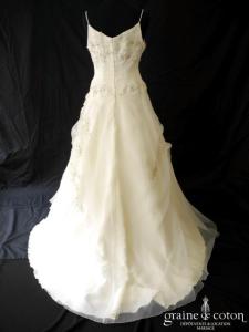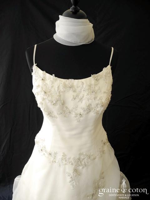 Robe une pièce en organza ivoire : bustier avec fines bretelles, décolleté arrondi, brodé de perles argentées. Jupe évasée avec relevés d’organza et rappels de perles, petite traîne. Housse et étole incluse.