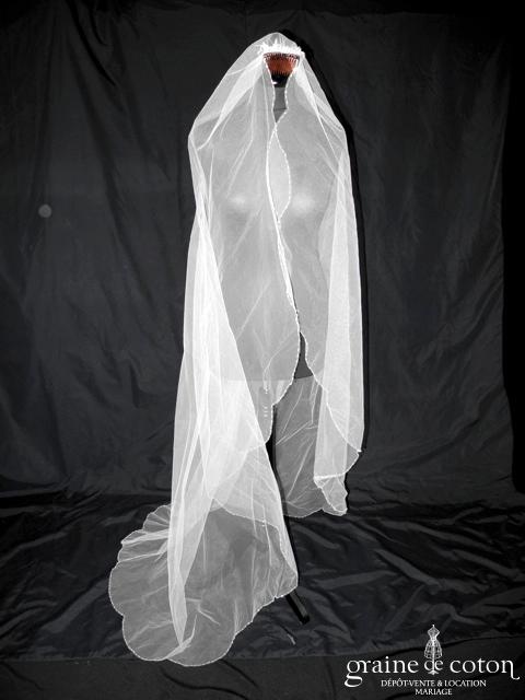 Voile long de 2 mètres en tulle ivoire bordé de fines perles. Sas rabat avant, monté sur peigne.