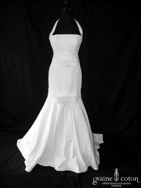 Robe une pièce en taffetas blanc : bustier avec bretelles tour de cou ornée de perles tubes argentées, ceinture avec noeud à la taille. Jupe sirène largement évasée avec ceinture et noeud en rappel. Surprenante, longiligne, effet garanti !