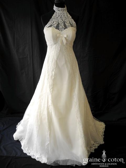 Robe une pièce en dentelle ivoire : bustier empire avec empiècement de dentelle sur le décolleté se terminant en tour de cou (possibilité de l’enlever sur devis). Jupe trapèze tout en dentelle perlée, fluide avec longue traîne. Un beau modèle très classe.