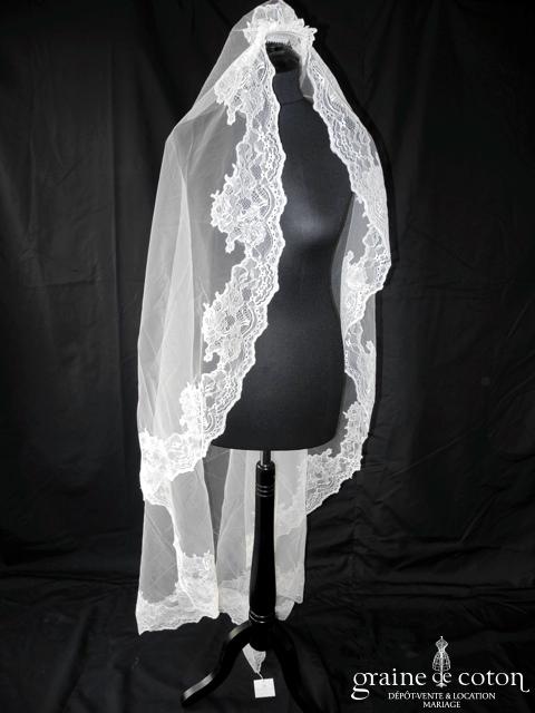 Voile long de 1,80 mètres en tulle bordé de fine dentelle ivoire. Monté sur peigne, pas de rabat avant.