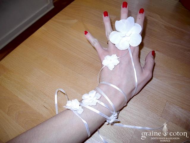 Bijou de doigt et main en satin ivoire : long ruban de satin avec fleurs en tissu, à nouer autour de la main et du bras.