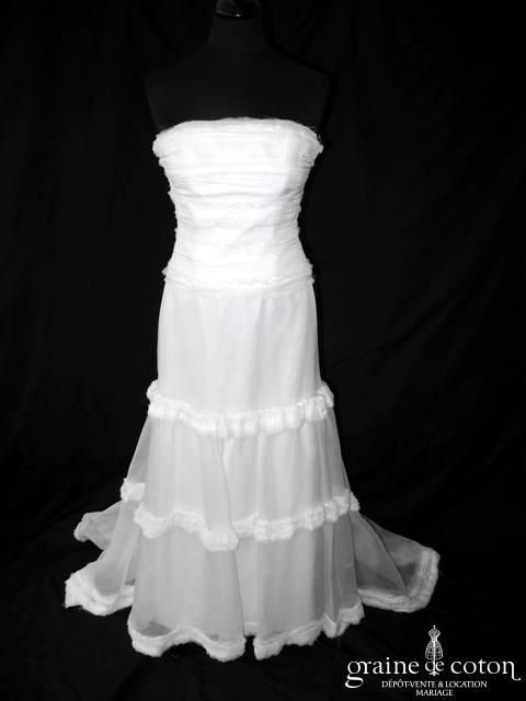 Robe une pièce en organza de soie ivoire : bustier travaillé de bandes horizontales d’organza, dos boutonné. Jupe trapèze bien évasée avec système de boutons pour relever la traîne. Légère, bien coupée, belle matière. Housse incluse.