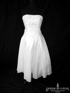 Robe mi longue pouvant être raccourcie en taffetas ivoire : bustier travaillé de perles argentées, ceinture drapée à la taille. Un modèle frais et léger. Housse incluse.