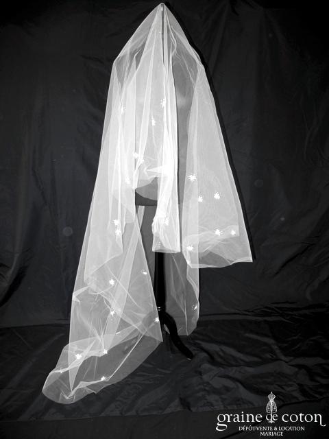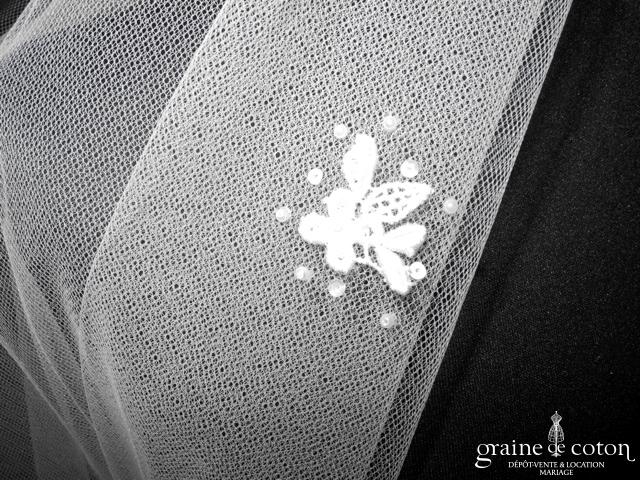Voile long de 2,50 mètres en tulle ivoire avec guipure de dentelle, non monté sur peigne.