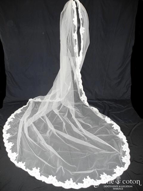 Voile long de 3,70 mètres en tulle ivoire clair bordé de dentelle de Calais, monté sur peigne. Pas de rabat avant. Une magnifique pièce.