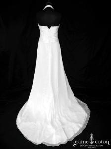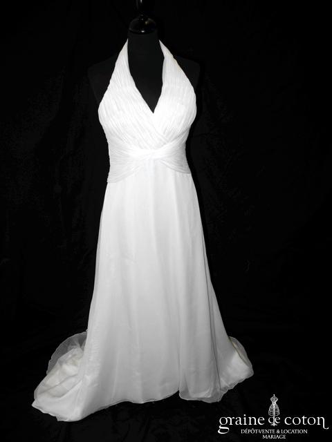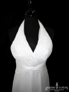 Robe une pièce en mousseline de soie plissée ivoire : bustier taille empire soulignée d’un drapé avec bretelle tour de cou et décolleté en V. Jupe fluide avec traîne pouvant se remonter. Dos boutonné. Un modèle épuré et très élégant. Housse incluse.