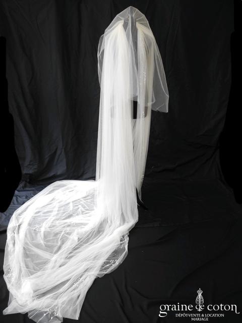 Pronovias – Voile long de 3 mètres en tulle de soie ivoire perlé de marguerites