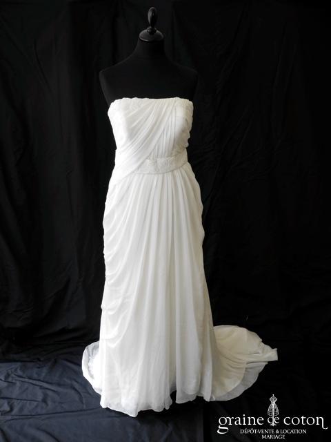 Robe une pièce en mousseline ivoire : bustier empire drapé avec fines perles, découpe coeur. Ceinture perlée. Jupe fluide avec 2 pans de traîne en mousseline, beau tombé. Housse et boléro assorti en tulle de soie avec manches inclus.