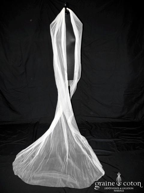 Voile long de 2,80m en tulle de soie ivoire, sans rabat avant et monté sur peigne. Une belle matière.