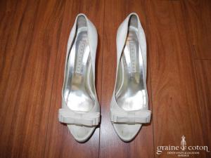Escarpins ivoires en satin de soie avec noeud, bout ouvert. Talon de 8 cm, semelle avant compensée sur 2,5 cm.