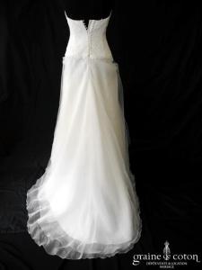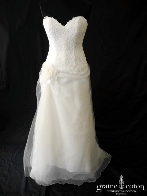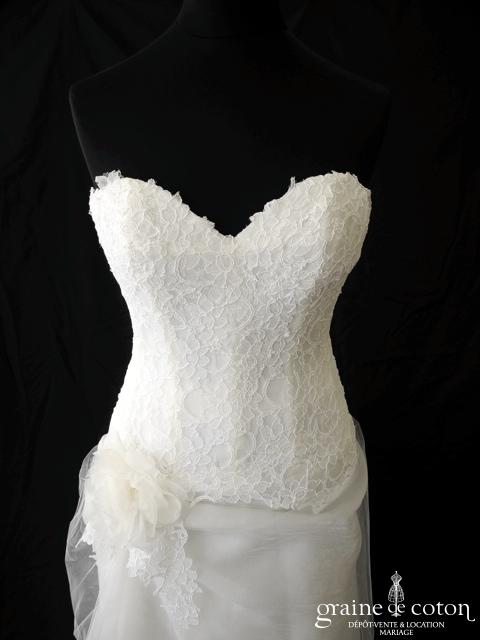 Robe une pièce ivoire clair : bustier coeur boutonné, tout en dentelle. Jupe trapèze légèrement évasée en organza et tulle avec fleur sur la taille. Légère et fraîche, très raffinée.