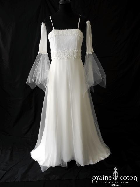 Robe une pièce ivoire clair : bustier à fines bretelles avec manchettes à part, taille empire recouverte de dentelle de coton et petites roses ivoires en tissu. Jupe fluide en mousseline de soie et tulle, légèrement évasée. Un modèle pur, léger, féérique ;o) Housse incluse.