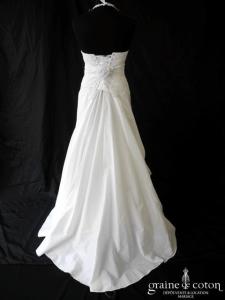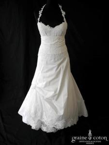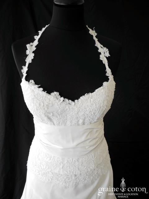 Robe deux pièces blanche : bustier tour de cou en dentelle de Calais avec ceinture de taffetas amovible. Dos lacé. Jupe trapèze en taffetas ouverte sur du tulle finition dentelle, comme le bustier. Fraîche, beau tombé. Jupon inclus.
