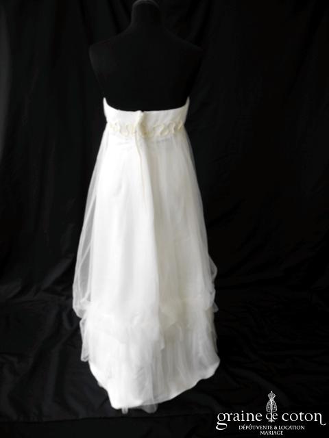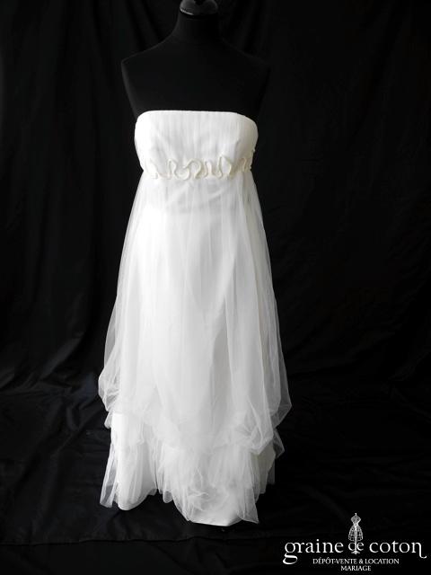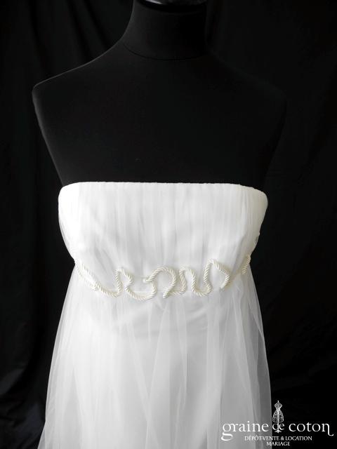 Robe une pièce en tulle ivoire : bustier empire souligné d’une ceinture en cordon de soie, fines bretelles amovibles. Jupe façon boule, tombé fluide, pas de traîne. Originale et fraîche. Housse incluse.