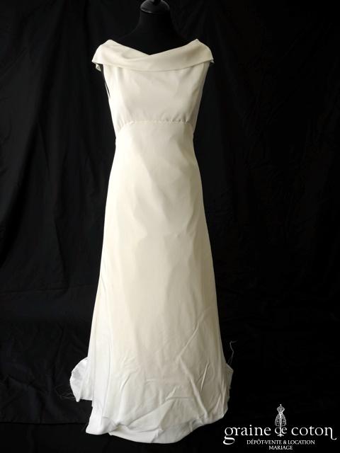 Robe une pièce en crêpe de soie ivoire : bustier encolure bateau et taille empire, dos boutonné. Jupe fluide légèrement évasée, doublée de taffetas plus rigide qu’il est possible de changer pour une matière plus souple. Classe et très élégant. Housse en tissu incluse.