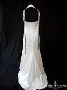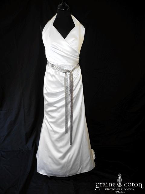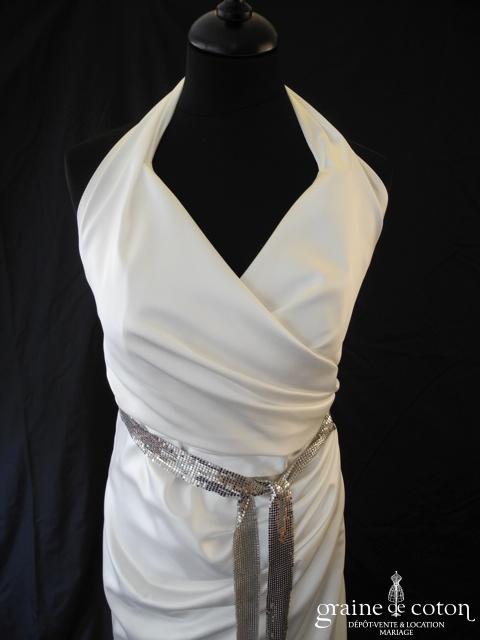 Robe une pièce en satin ivoire : bustier avec large bretelle tour de cou, drapé. Ceinture amovible en métal argenté façon paillettes. Jupe fluide près du corps, légèrement évasée en bas, avec petite traîne. Classe et élégante. Housse et jupon inclus