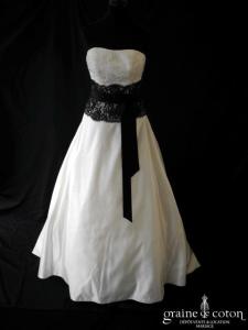 Robe une pièce en satin blanc : bustier coeur recouvert de dentelle avec large ceinture de dentelle et satin noir à la taille. Jupe évasée forme trapèze tout en satin avec longue traîne. Chic et élégante.