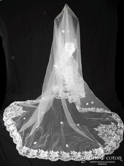 Voile long de 3 mètres en tulle ivoire bordé de broderies, non monté sur peigne. Applications de fleurs en dentelle sur tout le voile.