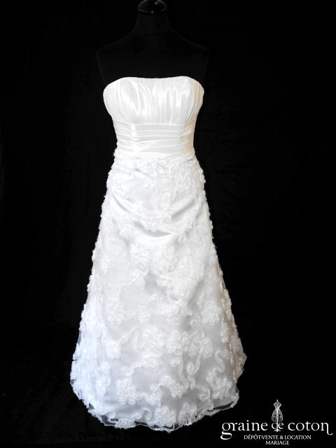 Robe une pièce ivoire : bustier empire en taffetas drapé à la taille. Jupe trapèze légèrement évasée en tulle brodé de fleurs façon coton duveteux. Toute petite traîne. Originale et seyante. Housse et jupon inclus.