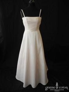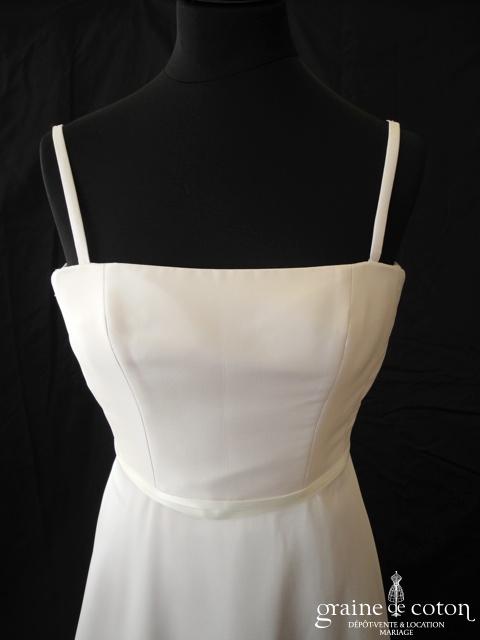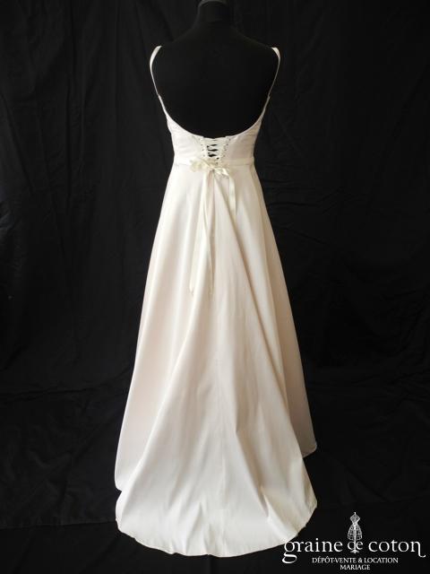 Robe une pièce en mikado violine : bustier travaillé en plusieurs pans, fines bretelles, double ceinture de satin à la taille et dos lacé avec profond décolleté arrondi. Jupe forme trapèze avec petite traîne. Style épuré, belle matière, élégance garantie !