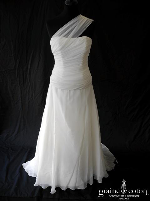 Robe une pièce en mousseline ivoire clair : bustier drapé avec une bretelle traversante. Jupe taille basse fluide soulignée d’une ceinture (qui peut se porter aussi à la taille) avec petite traîne remontable par des rubans. Légère, moderne, pure. Housse et jupon inclus.