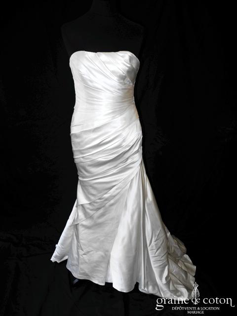 Robe une pièce en satin ivoire : bustier drapé taille basse, jupe sirène légèrement évasée avec traîne pouvant se relever par 6 rubans. Un modèle épuré et très élégant.