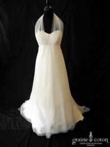Robe une pièce en satin ivoire clair : bustier empire avec guipure de dentelle, dos lacé. Deux pans en tulle partent de la taille empire pour se nouer autour du cou. Jupe fluide légèrement évasée en tulle, beau mouvement. Fraîche et facile à porter. Housse et jupon inclus.