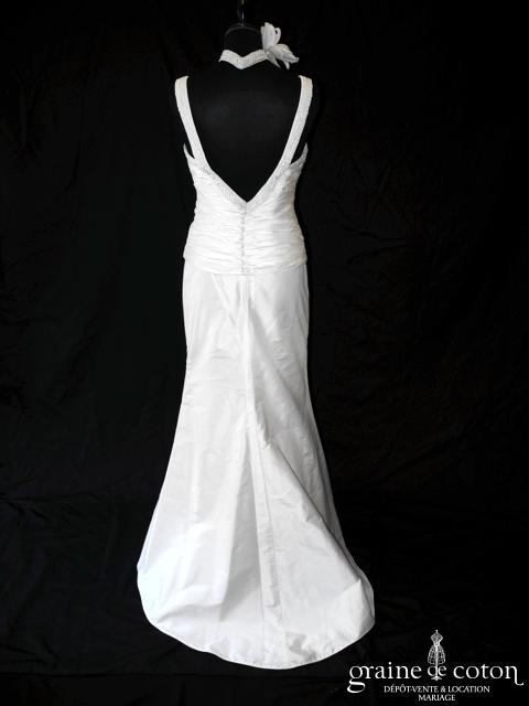 Robe deux pièces en soie sauvage ivoire : bustier avec larges bretelles perlées se terminant en V dans le creux du dos, avant drapé et dos boutonné. Jupe sirène en soie sauvage avec petite traîne. Tour de cou assorti inclus. Grande classe et très originale.