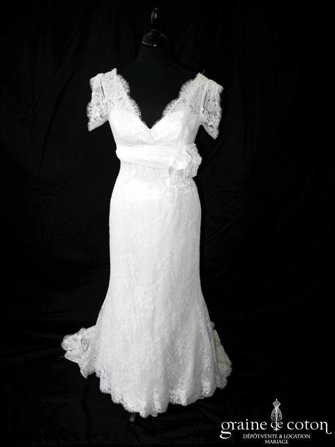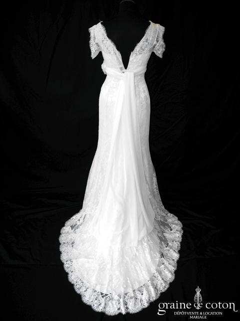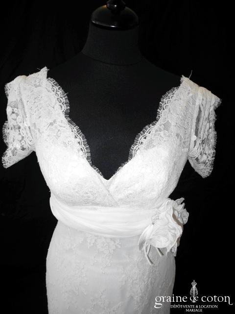 Robe une pièce ivoire clair : sous robe en satin, sur robe en dentelle de Calais. Bustier taille empire avec larges bretelles, ouverture en V des décolletés dos et devant. Ceinture en mousseline sous la poitrine avec fleur amovible en tissu. Jupe près du corps avec traîne pouvant se remonter. Belles matières et coupe longiligne. Housse et jupon inclus.