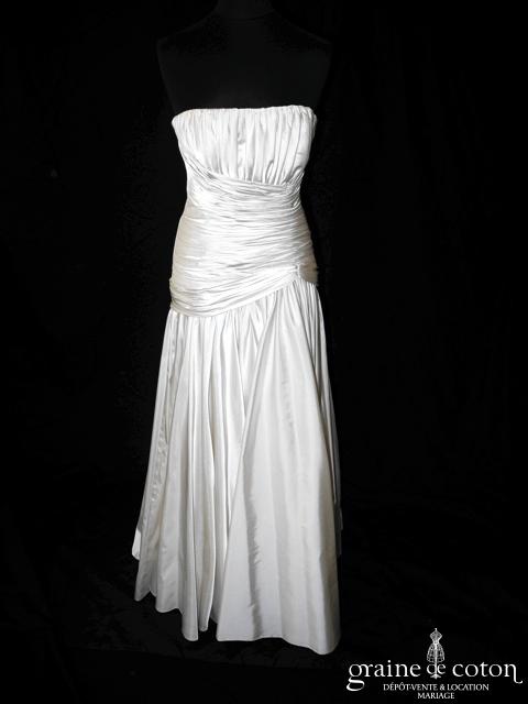Robe une pièce en satin ivoire : bustier drapé avec laçage dans le dos. Jupe taille basse fluide légèrement évasée, épurée. Pas de traîne. Un modèle simple et chic.