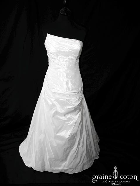 Robe une pièce en taffetas ivoire clair : bustier en pointe asymétrique drapé, jupe trapèze épurée sans traîne. Fraîche, légère et seyante. Housse et jupon inclus.