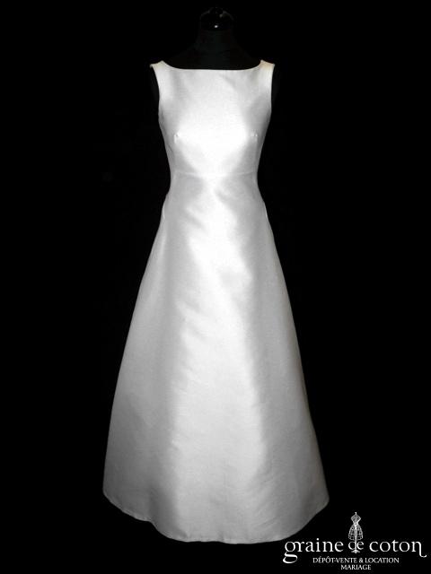 Robe une pièce en mikado de satin blanc : encolure bateau, taille empire et dos boutonné. Jupe trapèze épurée avec petite traîne. Sobre et efficace. Jupon inclus.