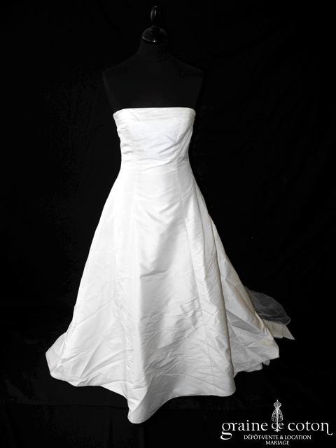 Robe une pièce en soie sauvage ivoire : bustier avec 3 plis sur le bord du décolleté, petits boutons au dos. Jupe trapèze sur l’avant, ouverte sur l’arrière avec traîne en organza. Un modèle original et épuré, élégance garantie !