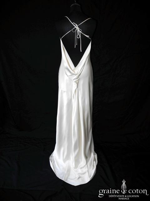 Robe une pièce en satin de soie ivoire : encolure drapée arrondie, fines bretelles à nouer en bretelles simples ou croisées, dos nu drapé. Jupe fluide droite avec petite traîne. Épurée, glamour et très chic.