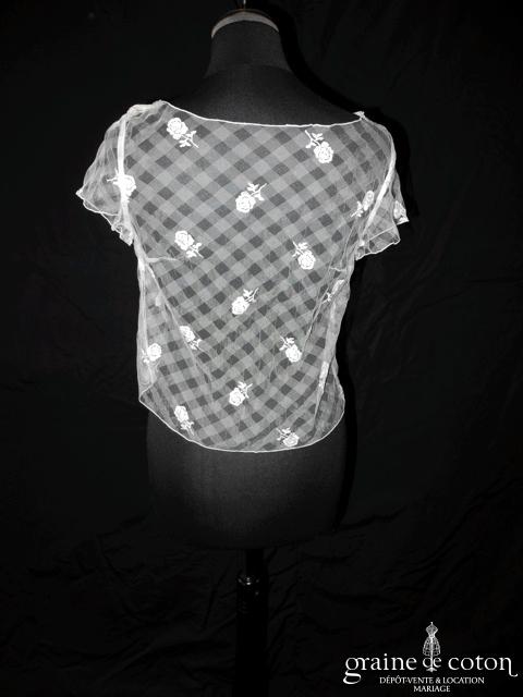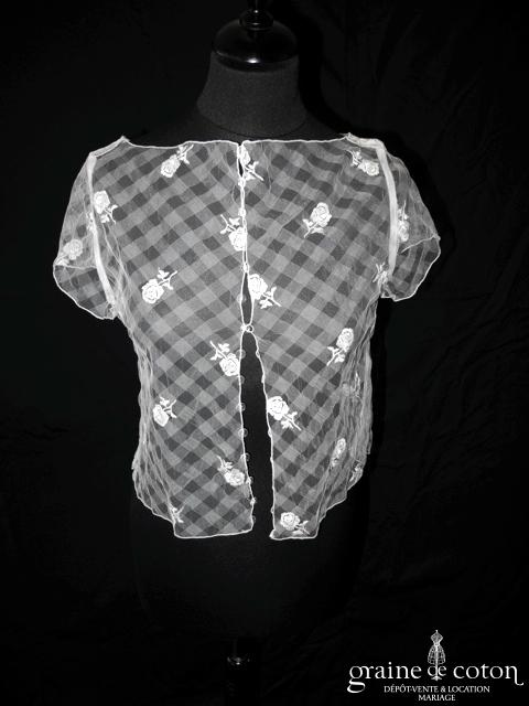 Boléro manches courtes en tulle ivoire brodé de fleurs, fermeture dos à boutons. Original et délicat.