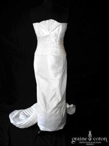 Robe une pièce en soie ivoire : bustier coeur avec plissé de soie au centre du décolleté. Taille drapée, dos boutonné. Jupe droite épurée évasée sur l’arrière avec longue traîne plissée. Classe et sobre.