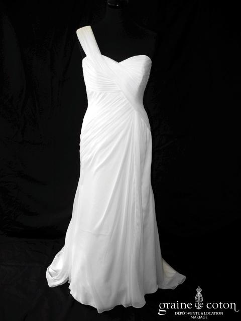 Robe une pièce en mousseline ivoire : bustier empire coeur drapé avec une bretelle asymétrique. Jupe fluide épurée avec longue traîne. Sobre et classe. Housse et jupon inclus.