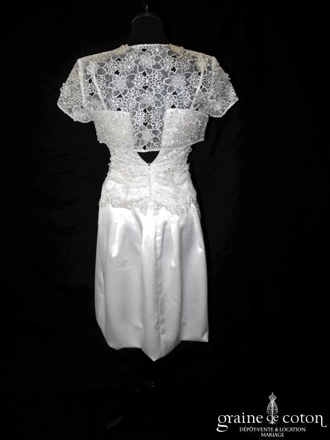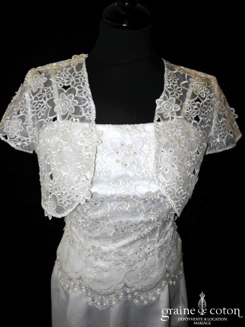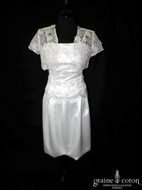 Robe en trois pièce : jupe effet boule en crêpe de satin ivoire, bustier en dentelle avec fines bretelles. Boléro en dentelle assortie, manches courtes. Raffinée et élégante, idéale pour un mariage civil.