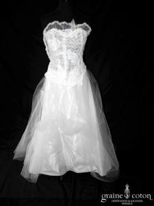 Robe deux pièces ivoire clair : bustier travaillé de dentelle et de plumes, très original, lacé dans le dos. Jupe en soie sauvage surmontée de tulle remonté par endroits et coupé de façon asymétrique. Un modèle moderne, écolo et frais ! Housse incluse.