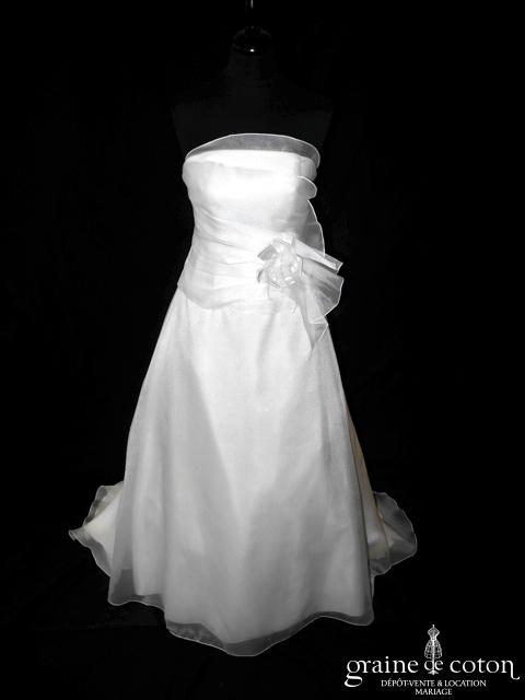Robe une pièce en organza ivoire clair : bustier drapé à la taille avec fleurs en organza et satin, dos lacé. Jupe trapèze légère, traîne. Une robe élégante et facile à porter. Housse incluse.