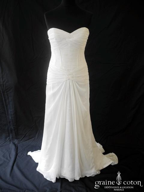 Robe une pièce en mousseline ivoire clair : bustier coeur drapé avec baleines marquées. Jupe sirène fluide, épurée, avec traîne pouvant se relever. Une « toge » incluse peut s’ajouter au niveau du décolleté dos avec des boutons pressions pour une longue traîne façon déesse grecque ;o) Sobre et chic. Housse incluse.