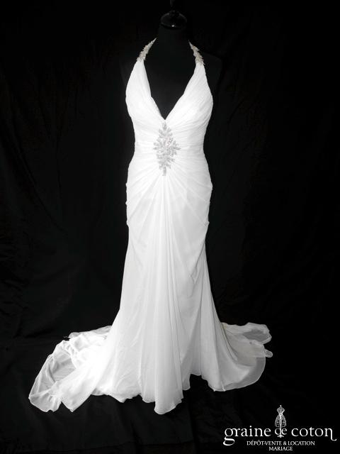Robe une pièce en mousseline de soie ivoire clair : bustier drapé avec bretelle tour de cou, empiècement brodé. Jupe fluide épurée avec longue traîne pouvant se relever. Sobre, chic et classe. Housse incluse.
