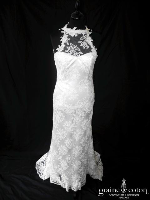 Robe en deux parties : sous robe bustier en satin fluide. Sur robe en dentelle montant jusqu’au cou, coupe droite avec petite traîne pouvant se relever. Grande élégance, belles matières.