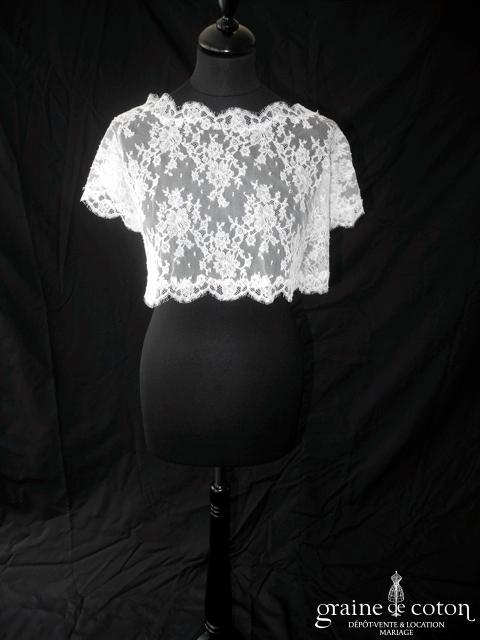 Top en dentelle ivoire avec petites manches : s’accroche idéalement à la robe n°2829 mais peut aussi s’adapter à d’autres modèles par pressions ou ajout de boutons (fermeture dans le dos).